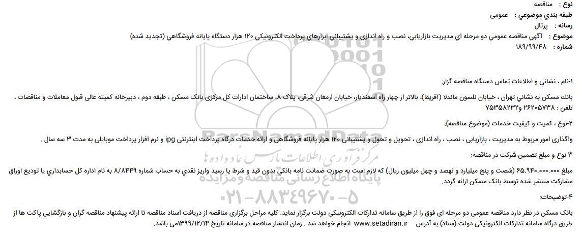 بانک مسکن در نظر دارد مناقصه عمومی دو مرحله ای فوق را از طریق سامانه تدارکات الکترونیکی دولت برگزار نماید. کلیه مراحل برگزاری مناقصه از دریافت اسناد مناقصه تا ارائه پیشنهاد مناقصه گران و بازگشایی پاکت ها از طریق درگاه سامانه تدارکات الکترونیکی دولت (ستاد) به آدرس ستاد ایران  انجام خواهد شد . زمان انتشار مناقصه در سامانه تاریخ 99.12.14 می باشد.