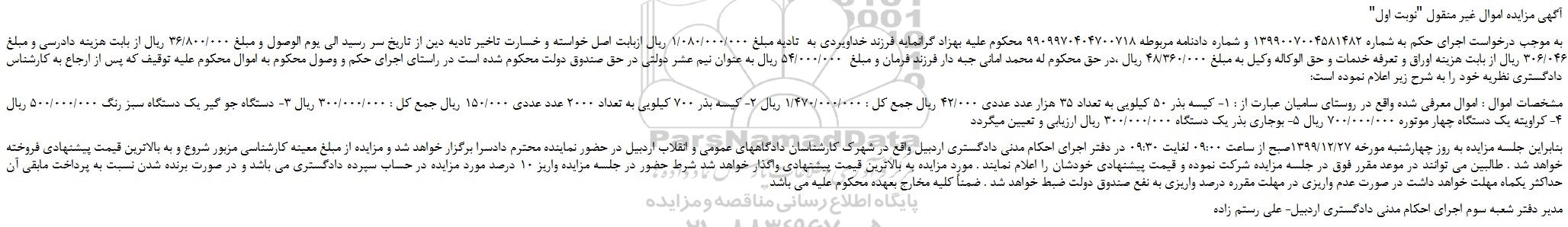 بنابراین جلسه مزایده به روز چهارشنبه مورخه 1399/12/27صبح از ساعت 09:00 لغایت 09:30 در دفتر اجرای احکام مدنی دادگستری اردبیل واقع در شهرک کارشناسان دادگاههای عمومی و انقلاب اردبیل در حضور نماینده محترم دادسرا برگزار خواهد شد و مزایده از مبلغ معینه کارشناسی مزبور شروع و به بالاترین قیمت پیشنهادی فروخته خواهد شد . طالبین می توانند در موعد مقرر فوق در جلسه مزایده شرکت نموده و قیمت پیشنهادی خودشان را اعلام نمایند . مورد مزایده به بالاترین قیمت پیشنهادی واگذار خواهد شد شرط حضور در جلسه مزایده واریز 10 درصد مورد مزایده در حساب سپرده دادگستری می باشد و در صورت برنده شدن نسبت به پرداخت مابقی آن حداکثر یکماه مهلت خواهد داشت در صورت عدم واریزی در مهلت مقرره درصد واریزی به نفع صندوق دولت ضبط خواهد شد . ضمناً کلیه مخارج بعهده محکوم علیه می باشد