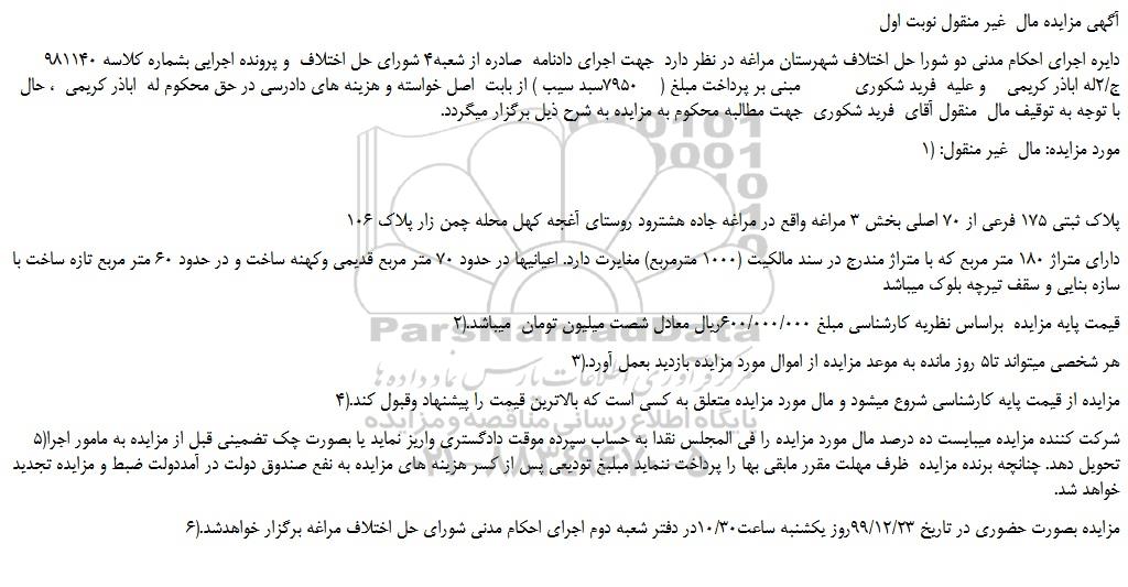 دایره اجرای احکام مدنی دو شورا حل اختلاف شهرستان مراغه در نظر دارد جهت اجرای دادنامه صادره از شعبه4 شورای حل اختلاف و پرونده اجرایی بشماره کلاسه 981140 ج/2له اباذر کریمی و علیه فرید شکوری مبنی بر پرداخت مبلغ ( 7950سبد سیب ) از بابت اصل خواسته و هزینه های دادرسی در حق محکوم له اباذر کریمی ، حال با توجه به توقیف مال منقول آقای فرید شکوری جهت مطالبه محکوم به مزایده به شرح ذیل برگزار میگردد.