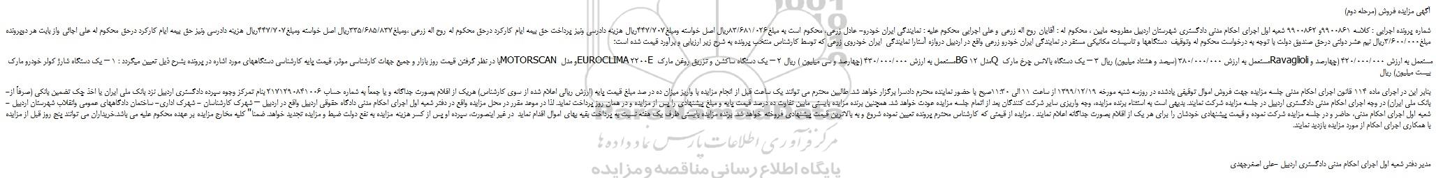 شماره پرونده اجرایی : کلاسه 9900861و 9900862 شعبه اول اجرای احکام مدنی دادگستری شهرستان اردبیل مطروحه مابین ، محکوم له : آقایان روح اله زرعی و علی اجرایی محکوم علیه : نمایندگی ایران خودرو- عادل زرعی، محکوم است به مبلغ83/681/026ریال اصل خواسته ومبلغ447/707ریال هزینه دادرسی ونیز پرداخت حق بیمه ایام کارکرد درحق محکوم له روح اله زرعی ،ومبلغ335/685/837ریال اصل خواسته ومبلغ447/707ریال هزینه دادرسی ونیز حق بیمه ایام کارکرد درحق محکوم له علی اجائی واز بابت هر دوپرونده مبلغ3/600/000ریال نیم عشر دولتی درحق صندوق دولت با توجه به درخواست محکوم له وتوقیف دستگاهها و تاسیسات مکانیکی مستقر در نمایندگی ایران خودرو زرعی واقع در اردبیل دروازه آستارا نمایندگی ایران خودروی زرعی که توسط کارشناس منتخب پرونده به شرح زیر ارزیابی و برآورد قیمت شده است؛