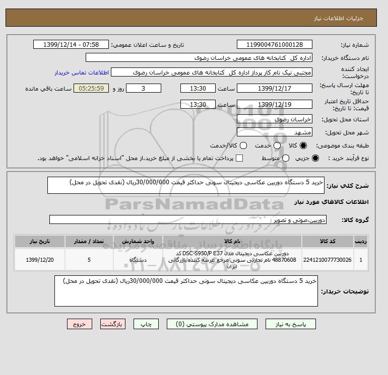 شرح کلی نیاز: خرید 5 دستگاه دوربین عکاسی دیجیتال سونی حداکثر قیمت 30/000/000ریال (نقدی تحویل در محل)
