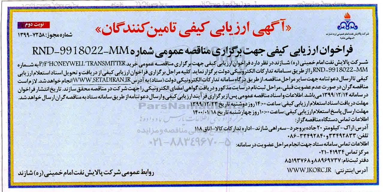 آگهی ارزیابی کیفی تامین کنندگان خرید P/F HONEYWELL TRANSMITTER- نوبت دوم , اریابی کیفی، آگهی ارزیابی کیفی تامین کنندگان خرید P/F HONEYWELL TRANSMITTER- نوبت دوم