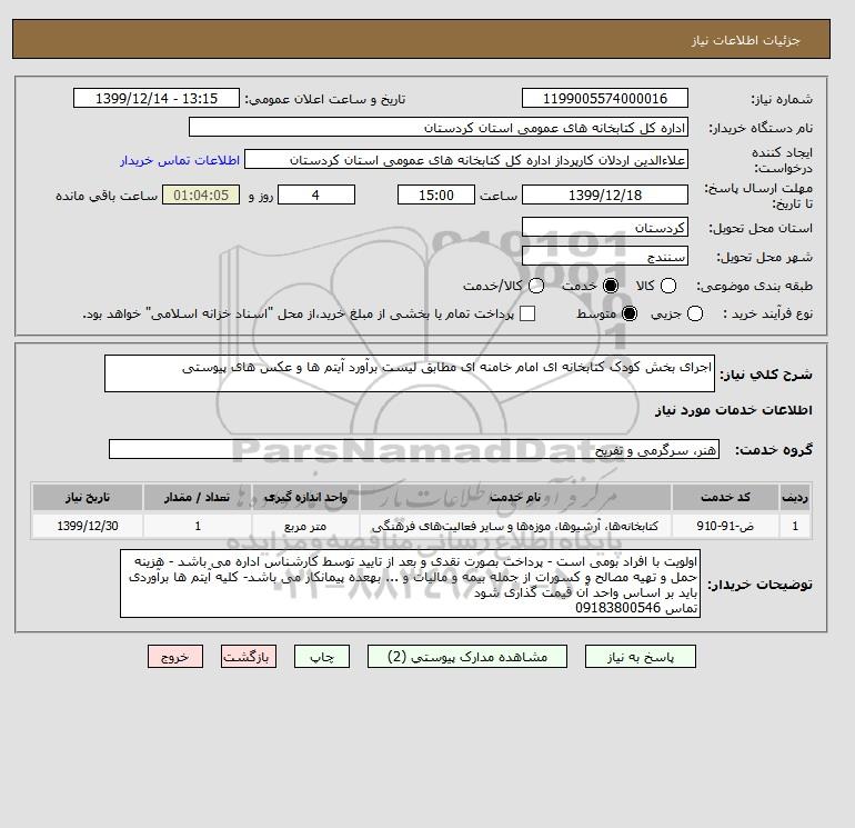 شرح کلی نیاز: اجرای بخش کودک کتابخانه ای امام خامنه ای مطابق لیست برآورد آیتم ها و عکس های پیوستی