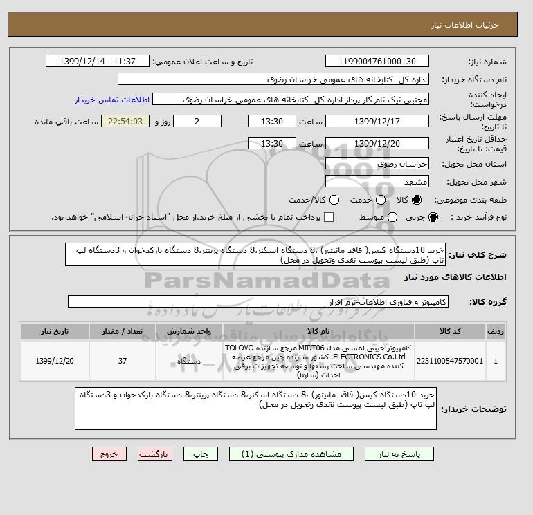 توضیحات خریدار:خرید 10دستگاه کیس( فاقد مانیتور) ،8 دستگاه اسکنر،8 دستگاه پرینتر،8 دستگاه بارکدخوان و 3دستگاه لپ تاپ (طبق لیست پیوست نقدی وتحویل در محل)