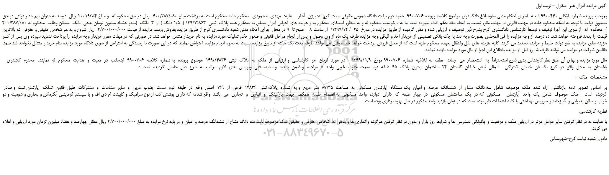 بموجب پرونده شماره بایگانی 9900440 شعبه اجرای احکام مدنی ساوجبلاغ دادگستری موضوع کلاسه پرونده 9900706 شعبه دوم نیابت دادگاه عمومی حقوقی نیابت کرج له: بیژن آهار علیه: مهدی محمودی محکوم علیه محکوم است به پرداخت مبلغ 400/387/080 ریال در حق محکوم له و مبلغ 20019354 ریال درصد به عنوان نیم عشر دولتی در حق صندوق دولت. با توجه به اینکه محکوم علیه در مهلت قانونی در مهلت مقرر نسبت به انجام مفاد حکم اقدام ننموده است بنا به درخواست محکوم له و به منظور استیفای محکوم به و هزینه های اجرایی اموال متعلق به محکوم علیه پلاک ثبتی 149/14863 ( 1/5 دانگ ) از 3 دانگ (صدو هشتاد میلیون تومان بدهی بانک مسکن وطلب محکوم له 400/387/080 ) محکوم له از سوی این اجرا توقیف و توسط کارشناسی دادگستری کرج بشرح ذیل توصیف و ارزیابی شده و مقرر گردیده از طریق مزایده در مورخ 25 / 1399/12/ از ساعت 8 صبح تا 9 در محل اجرای احکام مدنی شعبه دادگستری کرج از طریق مزایده بفروش برسد. مزایده از قیمت 4/700/000/000 ریال شروع و به هر شخص حقیقی و حقوقی که بالاترین قیمت را بدهد فروخته خواهد شد. ده درصد از وجه مزایده را فی المجلس بصورت وجه نقد یا چک بانکی تضمینی از خریدار اخذ و الباقی وجه مزایده ظرف یک ماه از وی وصول و پس از انجام مراحل قانونی و صدور حکم تملیک مورد مزایده به نام خریدار منتقل خواهد شد. در صورتی که در مهلت مقرر خریدار وجه مزایده را پرداخت ننماید سپرده وی پس از کسر هزینه های مزایده به نفع دولت ضبط و مزایده تجدید می گردد. کلیه هزینه های نقل وانتقال بعهده محکوم علیه است که از محل فروش پرداخت خواهد شد طرفین می توانند ظرف مدت یک هفته از تاریخ مزایده نسبت به نحوه انجام مزایده اعتراض نمایند که در این صورت تا رسیدگی به اعتراض از سوی دادگاه مورد مزایده بنام خریدار منتقل نخواهد شد ضمنا طالبین شرکت در مزایده می توانند ظرف 5 روز قبل از مزایده بااطلاع این اجرا از مال مورد مزایده بازدید نمایند.