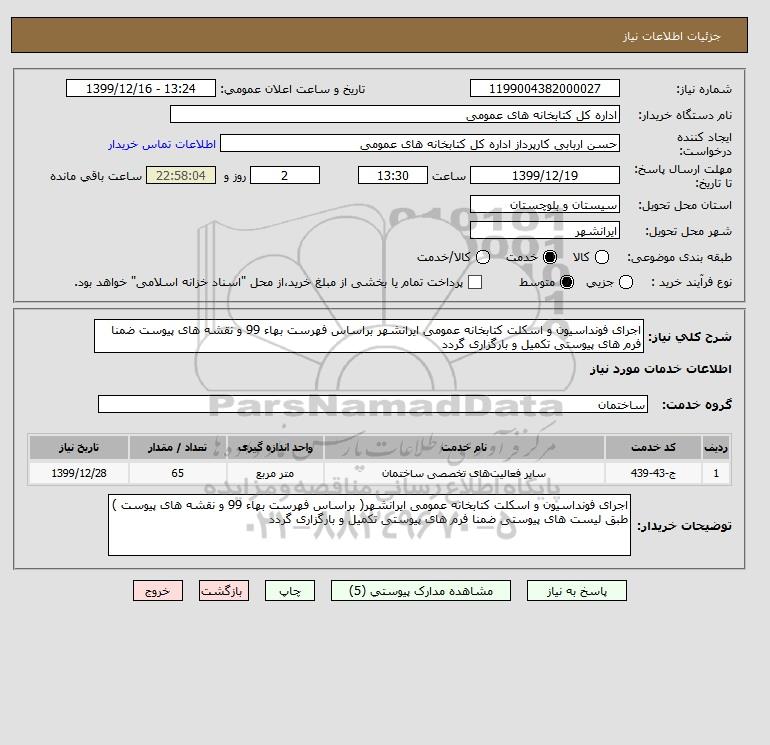شرح کلی نیاز: اجرای فونداسیون و اسکلت کتابخانه عمومی ایرانشهر براساس فهرست بهاء 99 و نقشه های پیوست ضمنا فرم های پیوستی تکمیل و بارگزاری گردد