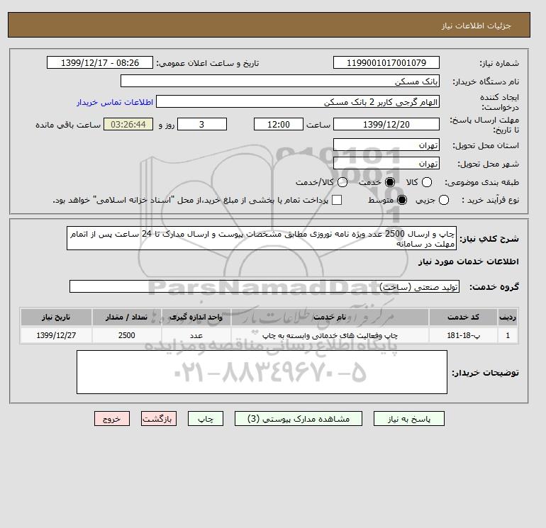 شرح کلی نیاز: چاپ و ارسال 2500 عدد ویژه نامه نوروزی مطابق مشخصات پیوست و ارسال مدارک تا 24 ساعت پس از اتمام مهلت در سامانه