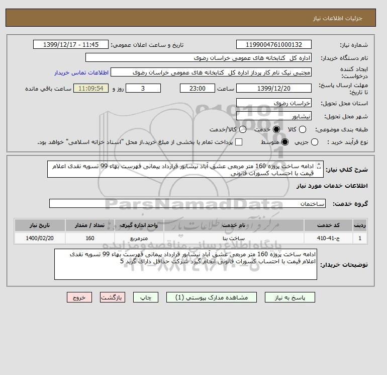 شرح کلی نیاز: ادامه ساخت پروژه 160 متر مربعی عشق آباد نیشابور قرارداد پیمانی فهرست بهاء 99 تسویه نقدی اعلام قیمت با احتساب کسورات قانونی