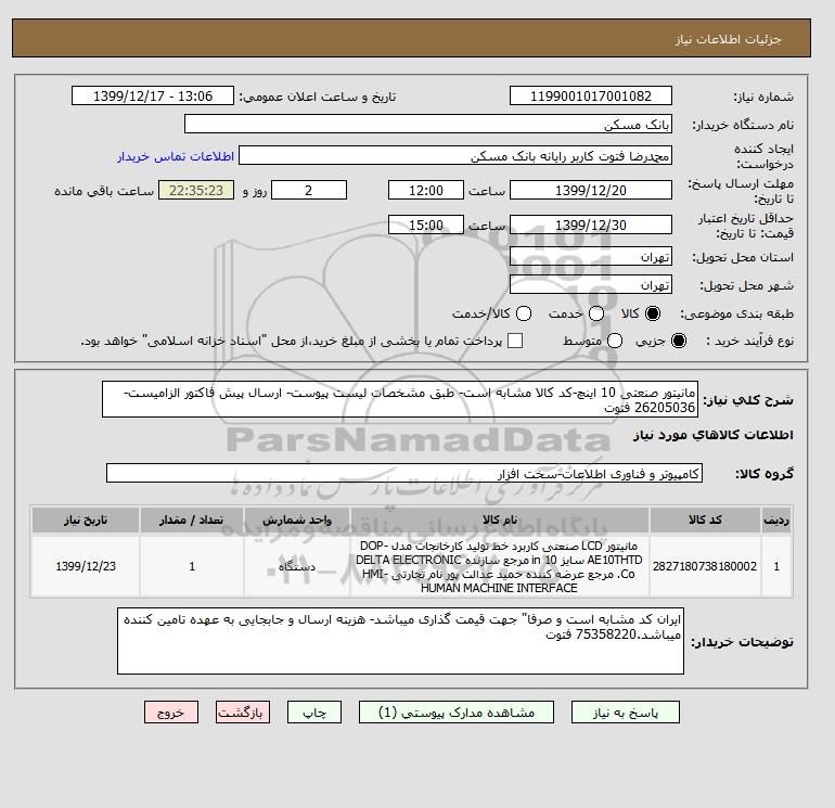 شرح کلی نیاز: مانیتور صنعتی 10 اینچ-کد کالا مشابه است- طبق مشخصات لیست پیوست- ارسال پیش فاکتور الزامیست-26205036 فتوت