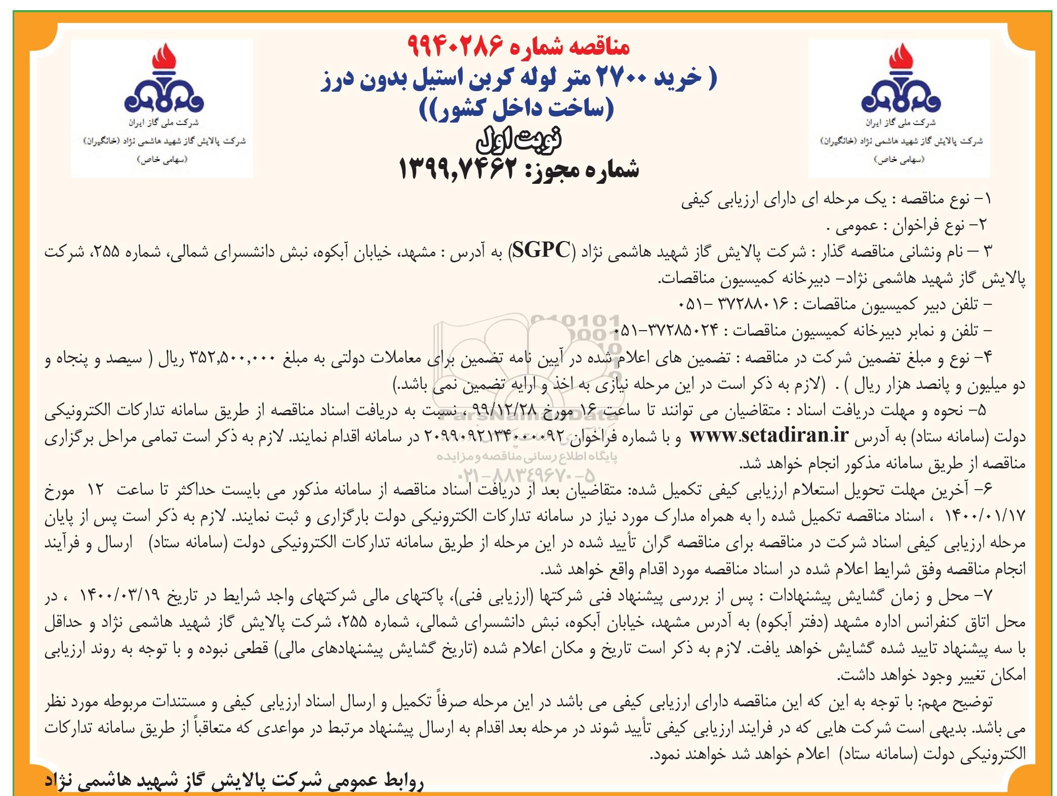 3- نام و نشانی مناقصه‌گزار: شرکت پالایش گاز شهید هاشمی نژاد (SGPC) به آدرس: مشهد، خیابان آبکوه، نبش دانشسرای شمالی، شماره 255، شرکت پالایش گاز شهید هاشمی نژاد– دبیرخانه کمیسیون مناقصات.