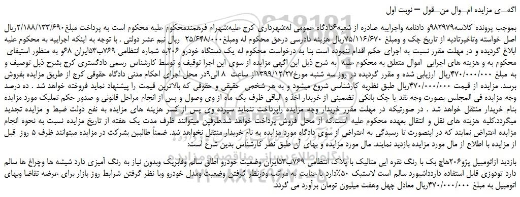 بموجب پرونده کلاسه982979و دادنامه واجراییه صادره از شعبه6دادگاه عمومی له:شهرداری کرج علیه:شهرام فرهمندمحکوم علیه محکوم است به پرداخت مبلغ2/188/133/690ریال اصل خواسته وتاخیرتادیه از تاریخ چک و ومبلغ 75/116/670ریال هزینه دادرسی درحق محکوم له ومبلغ25/648/000 ریال نیم عشر دولتی . با توجه به اینکه اجراییه به محکوم علیه ابلاغ گردیده و در مهلت مقرر نسبت به اجرای حکم اقدام ننموده است بنا به درخواست محکوم له یک دستگاه خودرو 206به شماره انتظامی 769ب53ایران 68و به منظور استیفای محکوم به و هزینه های اجرایی اموال متعلق به محکوم علیه به شرح ذیل این اگهی مزایده از سوی این اجرا توقیف و توسط کارشناس رسمی دادگستری کرج بشرح ذیل توصیف و به مبلغ 470/000/000ریال ارزیابی شده و مقرر گردیده در روز سه شنبه مورخ1399/12/27از ساعت 8 الی9در محل اجرای احکام مدنی دادگاه حقوقی کرج از طریق مزایده بفروش برسد. مزایده از قیمت 470/000/000ریال طبق نظریه کارشناسی شروع میشود و به هر شخص حقیقی و حقوقی که بالاترین قیمت را پیشنهاد نماید فروخته خواهد شد . ده درصد وجه مزایده فی المجلس بصورت وجه نقد یا چک بانکی تضمینی از خریدار اخذ و الباقی ظرف یک ماه از وی وصول و پس از انجام مراحل قانونی و صدور حکم تملیک مورد مزایده بنام خریدار منتقل خواهد شد . در صورتیکه در مهلت مقرر خریدار وجه مزایده راپرداخت ننماید سپرده وی پس از کسر هزینه های مزایده به نفع دولت ضبط و مزایده تجدید میگردد.کلیه هزینه های نقل و انتقال بعهده محکوم علیه است.که از محل فروش پرداخت خواهد شد.طرفین میتوانند ظرف مدت یک هفته از تاریخ مزایده نسبت به نحوه انجام مزایده اعتراض نمایند که در اینصورت تا رسیدگی به اعتراض از سوی دادگاه مورد مزایده به نام خریدار منتقل نخواهد شد. ضمناً طالبین بشرکت در مزایده میتوانند ظرف 5 روز قبل از مزایده با اطلاع از مال مورد مزایده بازدید نمایند. مال مورد مزایده و بهای آن طبق نظر کارشناس بدین شرح است: