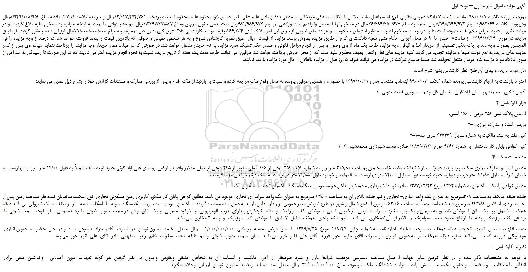 بموجب پرونده کلاسه 9900107 صادره از شعبه 7 دادگاه عمومی حقوقی کرج له:اسماعیل بیات ورکشی با وکالت مصطفی مرادخانی ومصطفی دهقان باغی علیه :علی اکبر وعباس خورمحکوم علیه محکوم است به پرداخت 12/647/494/761ریال ودرپرونده کلاسه 9900414/9به مبلغ 8/949/108/954ریال ودرپرونده کلاسه 982164به مبلغ 5/198/146/922ریال جمعا به مبلغ 26/794/750/637ریال در محکوم لها اسماعیل وابراهیم بیات ورکشی وومبلغ 481/986/977ریال بابت بدهی حقوق مرتهن ومبلغ 1/339/737/532ریال نیم عشر دولتی. با توجه به اینکه اجراییه به محکوم علیه ابلاغ گردیده و در مهلت مقررنسبت به اجرای حکم اقدام ننموده است بنا به درخواست محکوم له و به منظور استیفای محکوم به و هزینه های اجرایی از سوی این اجرا پلاک ثبتی 166/254توقیف توسط کارشناسی دادگستری کرج بشرح ذیل توصیف وبه مبلغ 31/000/000/000ریال ارزیابی شده و مقرر گردیده از طریق مزایده در مورخ 1399/12/19 از ساعت8 صبح تا 9 در محل اجرای احکام مدنی شعبه دادگستری کرج از طریق مزایده بفروش برسد. مزایده از قیمت ریال طبق نظریه کارشناس شروع و به هر شخص حقیقی و حقوقی که بالاترین قیمت را بدهد فروخته خواهد شد. ده درصد از وجه مزایده را فی المجلس بصورت وجه نقد یا چک بانکی تضمینی از خریدار اخذ و الباقی وجه مزایده ظرف یک ماه از وی وصول و پس از انجام مراحل قانونی و صدور حکم تملیک مورد مزایده به نام خریدار منتقل خواهد شد. در صورتی که در مهلت مقرر خریدار وجه مزایده را پرداخت ننماید سپرده وی پس از کسر هزینه های مزایده به نفع دولت ضبط و مزایده تجدید می گردد. کلیه هزینه های نقل وانتقال بعهده محکوم علیه است که از محل فروش پرداخت خواهد شد طرفین می توانند ظرف مدت یک هفته از تاریخ مزایده نسبت به نحوه انجام مزایده اعتراض نمایند که در این صورت تا رسیدگی به اعتراض از سوی دادگاه مورد مزایده بنام خریدار منتقل نخواهد شد ضمنا طالبین شرکت در مزایده می توانند ظرف 5 روز قبل از مزایده بااطلاع از مال مورد مزایده بازدید نمایند.