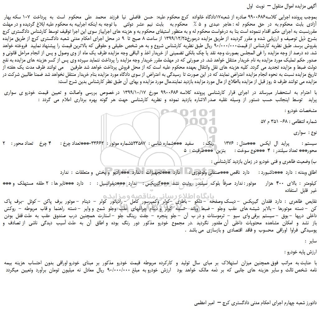 بموجب پرونده اجرایی کلاسه9900686 صادره از شعبه17دادگاه خانواده کرج محکوم علیه: حسن فاضلی نیا فرزند محمد علی محکوم است به پرداخت 107 سکه بهار آزادی بابت محکوم به در حق محکوم له : هاجر عبدی و 5 % محکوم به بابت نیم عشر دولتی .با توجه به اینکه اجراییه به محکوم علیه ابلاغ گردیده و در مهلت مقررنسبت به اجرای حکم اقدام ننموده است بنا به درخواست محکوم له و به منظور استیفای محکوم به و هزینه های اجراییاز سوی این اجرا توقیف توسط کارشناس دادگستری کرج بشرح ذیل توصیف و ارزیابی شده و مقرر گردیده از طریق مزایده درمورخ1399/12/25 از ساعت 8 صبح تا 9 در محل اجرای احکام مدنی شعبه دادگستری کرج از طریق مزایده بفروش برسد. طبق نظریه کارشناس از قیمت90/000/000 ریال طبق نظریه کارشناس شروع و به هر شخص حقیقی و حقوقی که بالاترین قیمت را پیشنهاد نمایید فروخته خواهد شد. ده درصد از وجه مزایده را فی المجلس بصورت وجه نقد یا چک بانکی تضمینی از خریدار اخذ و الباقی وجه مزایده ظرف یک ماه از وی وصول و پس از انجام مراحل قانونی و صدور حکم تملیک مورد مزایده به نام خریدار منتقل خواهد شد. در صورتی که در مهلت مقرر خریدار وجه مزایده را پرداخت ننماید سپرده وی پس از کسر هزینه های مزایده به نفع دولت ضبط و مزایده تجدید می گردد. کلیه هزینه های نقل وانتقال بعهده محکوم علیه است که از محل فروش پرداخت خواهد شد طرفین می توانند ظرف مدت یک هفته از تاریخ مزایده نسبت به نحوه انجام مزایده اعتراض نمایند که در این صورت تا رسیدگی به اعتراض از سوی دادگاه مورد مزایده بنام خریدار منتقل نخواهد شد ضمنا طالبین شرکت در مزایده می توانند ظرف 5 روز قبل از مزایده بااطلاع از مال مورد مزایده بازدید نمایند.مال مورد مزایده و بهای آن طبق نظر کارشناس بدین شرح است: