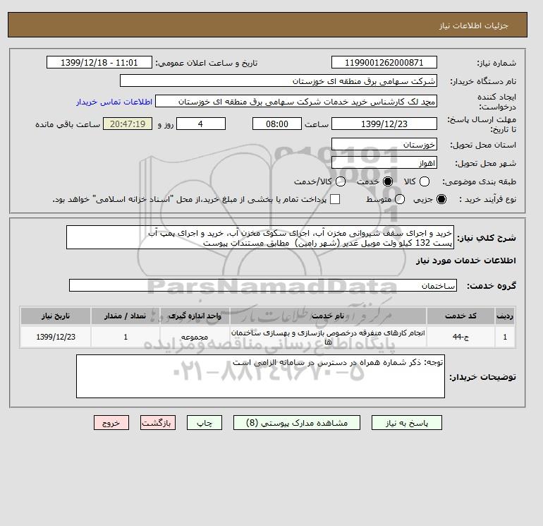 شرح کلی نیاز: خرید و اجرای سقف شیروانی مخزن آب، اجرای سکوی مخزن آب، خرید و اجرای پمپ آب پست 132 کیلو ولت موبیل غدیر (شهر رامین) مطابق مستندات پیوست