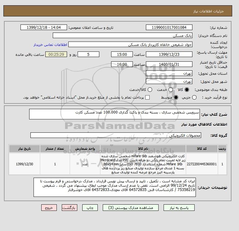 شرح کلی نیاز: سرویس شخصی سازی ، بسته بندی و پاکت گذاری 100.000 عدد مسکن کارت