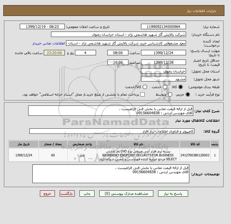 شرح کلی نیاز: قبل از ارائه قیمت تماس با بخش فنی الزامیست .