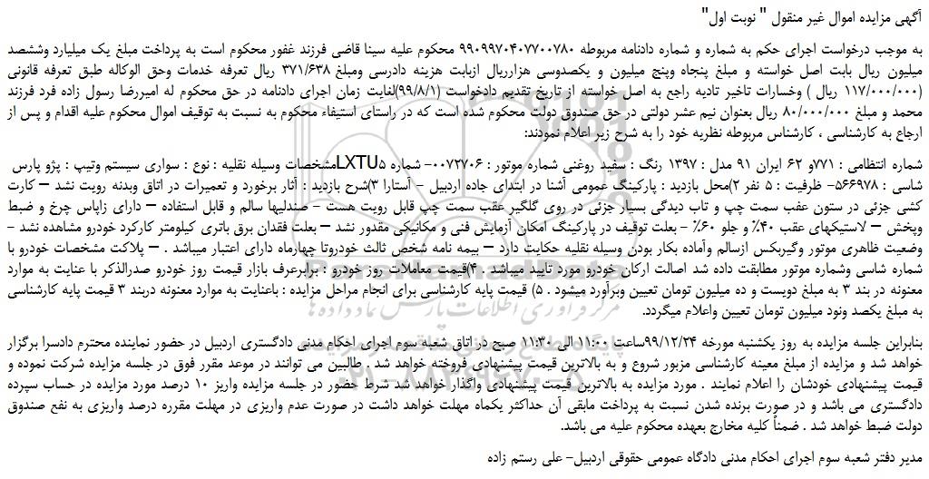 مشخصات وسیله نقلیه : نوع : سواری سیستم وتیپ : پژو پارس LXTU5 شماره انتظامی : 771و 62 ایران 91 مدل : 1397 رنگ : سفید روغنی شماره موتور : 0072706- شماره شاسی : 566978- ظرفیت : 5 نفر 2)محل بازدید : پارکینگ عمومی آشنا در ابتدای جاده اردبیل - آستارا 3)شرح بازدید : آثار برخورد و تعمیرات در اتاق وبدنه رویت نشد – کارت کشی جزئی در ستون عفب سمت چپ و تاب دیدگی بسیار جزئی در روی گلگیر عقب سمت چپ قابل رویت هست - صندلیها سالم و قابل استفاده – دارای زاپاس چرخ و ضبط وپخش – لاستیکهای عقب 40% و جلو 60% - بعلت توقیف در پارکینگ امکان آزمایش فنی و مکانیکی مقدور نشد – بعلت فقدان برق باتری کیلومتر کارکرد خودرو مشاهده نشد - وضعیت ظاهری موتور وگیربکس ازسالم وآماده بکار بودن وسیله نقلیه حکایت دارد – بیمه نامه شخص ثالث خودروتا چهارماه دارای اعتبار میباشد . – پلاکت مشخصات خودرو با شماره شاسی وشماره موتور مطابقت داده شد اصالت ارکان خودرو مورد تایید میباشد . 4)قیمت معاملات روز خودرو : برابرعرف بازار قیمت روز خودرو صدرالذکر با عنایت به موارد معنونه در بند 3 به مبلغ دویست و ده میلیون تومان تعیین وبرآورد میشود . 5) قیمت پایه کارشناسی برای انجام مراحل مزایده : باعنایت به موارد معنونه دربند 3 قیمت پایه کارشناسی به مبلغ یکصد ونود میلیون تومان تعیین واعلام میگردد.