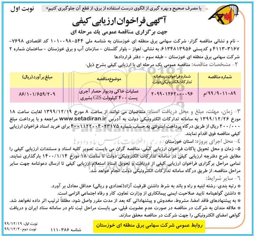 | 99/9011089/م | 2099001262000096 | عملیات خاکی و دیوار حصار آجری پست 400 کیلوولت GIS بشیری | 86.101.659.209 |
