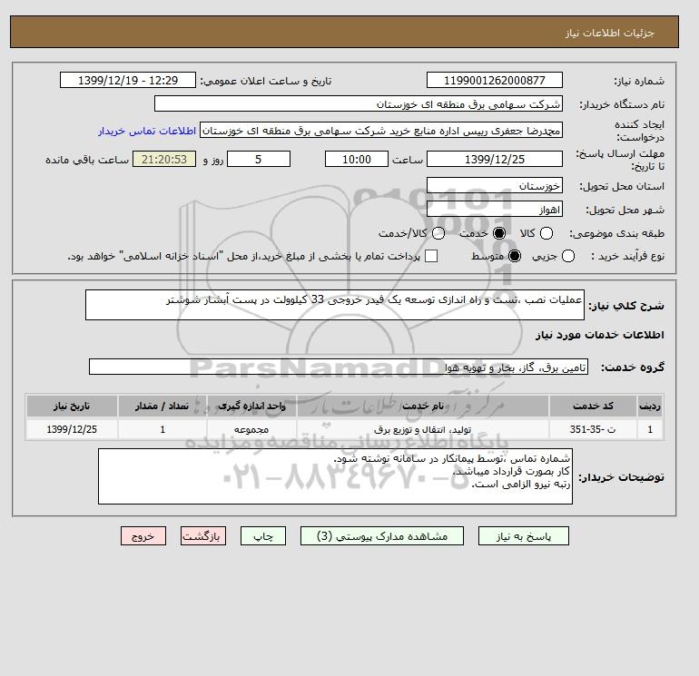 استعلام عملیات نصب ،تست و راه اندازی توسعه یک فیدر خروجی 33 کیلوولت در پست آبشار شوشتر, استعلام عملیات نصب ،تست و راه اندازی توسعه یک فیدر خروجی 33 کیلوولت در پست آبشار شوشتر