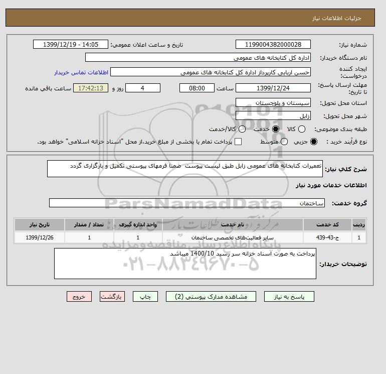 شرح کلی نیاز: تعمیرات کتابخانه های عمومی زابل طبق لیست پیوست ضمنا فرمهای پیوستی تکمیل و بارگزاری گردد