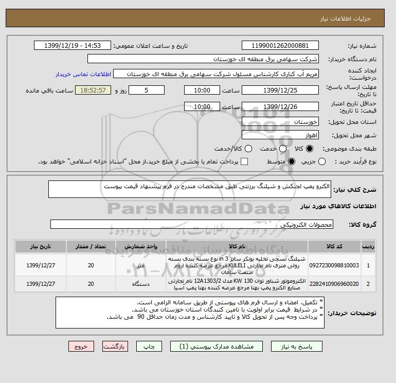 شرح کلی نیاز: الکترو پمپ لجنکش و شیلنگ برزنتی طبق مشخصات مندرج در فرم پیشنهاد قیمت پیوست