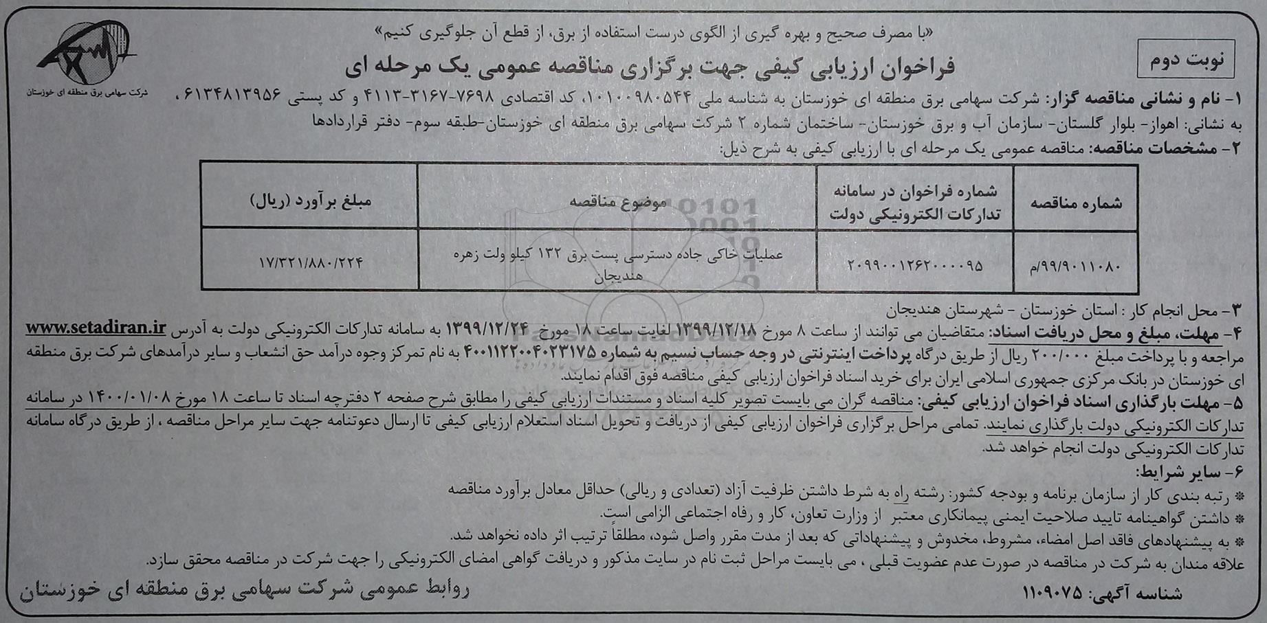 | 99/9011080 / م | 2099001262000095 | عملیات خاکی جاده دسترسی پست برق 132 کیلو ولت زهره هندیجان |