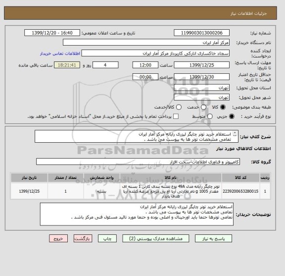 شرح کلی نیاز: استعلام خرید تونر چاپگر لیزری رایانه مرکز آمار ایران