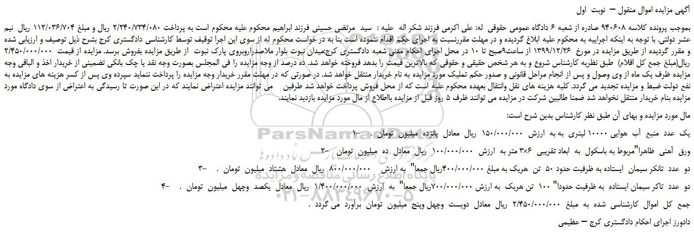 بموجب پرونده کلاسه 940608 صادره از شعبه 6 دادگاه عمومی حقوقی له: علی اکرمی فرزند شکر اله علیه : سید مرتضی حسینی فرزند ابراهیم محکوم علیه محکوم است به پرداخت 2/240/734/080 ریال و مبلغ 112/036/704 ریال نیم عشر دولتی. با توجه به اینکه اجراییه به محکوم علیه ابلاغ گردیده و در مهلت مقررنسبت به اجرای حکم اقدام ننموده است بنا به در خواست محکوم له از سوی این اجرا توقیف توسط کارشناسی دادگستری کرج بشرح ذیل توصیف و ارزیابی شده و مقرر گردیده از طریق مزایده در مورخ 1399/12/26 از ساعت9صبح تا 10 در محل اجرای احکام مدنی شعبه دادگستری کرج:میدان نبوت بلوار ملاصدراروبروی پارک نبوت از طریق مزایده بفروش برسد. مزایده از قیمت 2/450/000/000 ریال(مبلغ جمع کل اقلام) طبق نظریه کارشناس شروع و به هر شخص حقیقی و حقوقی که بالاترین قیمت را بدهد فروخته خواهد شد. ده درصد از وجه مزایده را فی المجلس بصورت وجه نقد یا چک بانکی تضمینی از خریدار اخذ و الباقی وجه مزایده ظرف یک ماه از وی وصول و پس از انجام مراحل قانونی و صدور حکم تملیک مورد مزایده به نام خریدار منتقل خواهد شد. در صورتی که در مهلت مقرر خریدار وجه مزایده را پرداخت ننماید سپرده وی پس از کسر هزینه های مزایده به نفع دولت ضبط و مزایده تجدید می گردد. کلیه هزینه های نقل وانتقال بعهده محکوم علیه است که از محل فروش پرداخت خواهد شد طرفین می توانند مزایده اعتراض نمایند که در این صورت تا رسیدگی به اعتراض از سوی دادگاه مورد مزایده بنام خریدار منتقل نخواهد شد ضمنا طالبین شرکت در مزایده می توانند ظرف 5 روز قبل از مزایده بااطلاع از مال مورد مزایده بازدید نمایند.