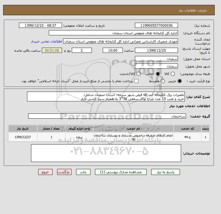 شرح کلی نیاز: تعمیرات برق کتابخانه آیت الله فیض شهر سرخه، استان سمنان شامل: