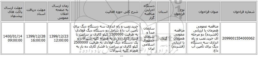 | 2099001554000062 | مناقصه عمومی همزمان با ارزیابی (فشرده) دو مرحله ای خرید،نصب و راه اندازی سه دستگاه دیگ برای تأمین آب داغ | مناقصه عمومی همزمان با ارزیابی (فشرده) | گیلان | سازمان صدا و سیمای جمهوری اسلامی ایران | خرید،نصب و راه اندازی سه دستگاه دیگ برای تأمین آب داغ شامل دو دستگاه دیگ فولادی به ظرفیت 1500000 کیلو کالری بر ساعت با فشار کاری ده بار به همراه کلیه شیرآلات و یک دستگاه دیگ فولادی به ظرفیت 2500000 کیلو کالری بر ساعت با فشار کاری ده بار به همراه کلیه شیرآلات | 1399/12/23 12:00:00 | 1399/12/28 16:00:00 | 1400/01/14 09:00:00 |