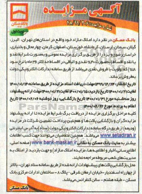 مزایده فروش املاک مازاد نوبت اول در استان تهران ، البرز ، گیلان ، سمنان و غیره