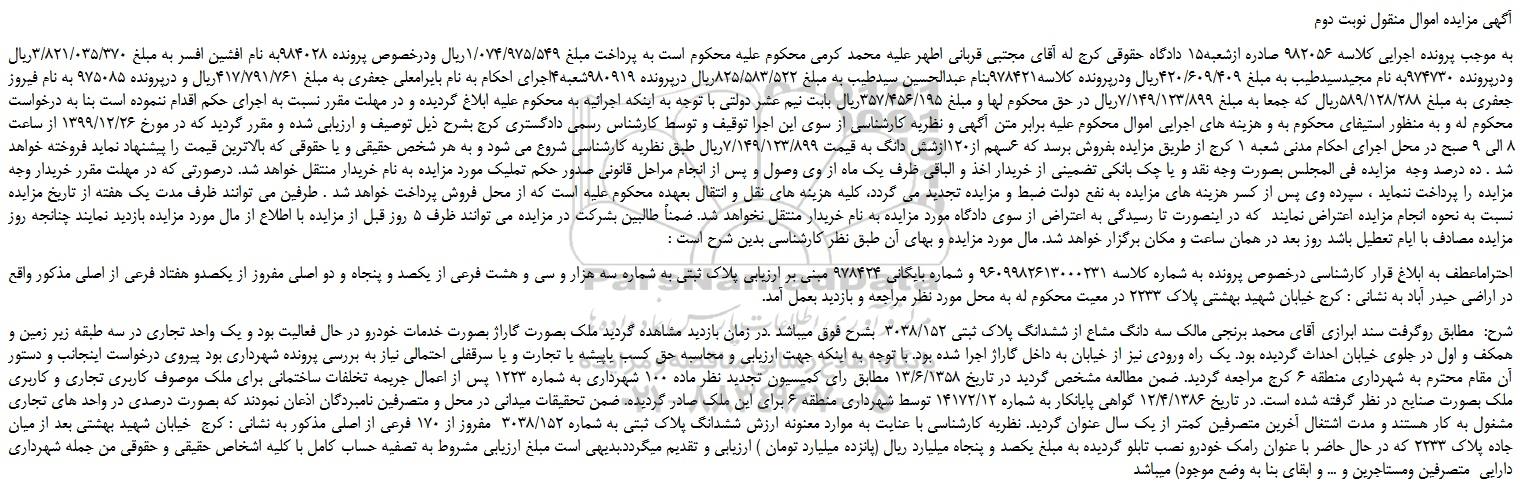 به موجب پرونده اجرایی کلاسه 982056 صادره ازشعبه15 دادگاه حقوقی کرج له آقای مجتبی قربانی اطهر علیه محمد کرمی محکوم علیه محکوم است به پرداخت مبلغ 1/074/975/549ریال ودرخصوص پرونده 984028به نام افشین افسر به مبلغ 3/821/035/370ریال ودرپرونده 974730به نام مجیدسیدطیب به مبلغ 420/609/409ریال ودرپرونده کلاسه978421بنام عبدالحسین سیدطیب به مبلغ 825/583/522ریال درپرونده 980919شعبه4اجرای احکام به نام بایرامعلی جعفری به مبلغ 417/791/761ریال و درپرونده 975085 به نام فیروز جعفری به مبلغ 589/128/288ریال که جمعا به مبلغ 7/149/123/899ریال در حق محکوم لها و مبلغ 357/456/195ریال بابت نیم عشر دولتی با توجه به اینکه اجرائیه به محکوم علیه ابلاغ گردیده و در مهلت مقرر نسبت به اجرای حکم اقدام ننموده است بنا به درخواست محکوم له و به منظور استیفای محکوم به و هزینه های اجرایی اموال محکوم علیه برابر متن آگهی و نظریه کارشناسی از سوی این اجرا توقیف و توسط کارشناس رسمی دادگستری کرج بشرح ذیل توصیف و ارزیابی شده و مقرر گردید که در مورخ 1399/12/26 از ساعت 8 الی 9 صبح در محل اجرای احکام مدنی شعبه 1 کرج از طریق مزایده بفروش برسد که 6سهم از120ازشش دانگ به قیمت 7/149/123/899ریال طبق نظریه کارشناسی شروع می شود و به هر شخص حقیقی و یا حقوقی که بالاترین قیمت را پیشنهاد نماید فروخته خواهد شد . ده درصد وجه  مزایده فی المجلس بصورت وجه نقد و یا چک بانکی تضمینی از خریدار اخذ و الباقی ظرف یک ماه از وی وصول و پس از انجام مراحل قانونی صدور حکم تملیک مورد مزایده به نام خریدار منتقل خواهد شد. درصورتی که در مهلت مقرر خریدار وجه مزایده را پرداخت ننماید ، سپرده وی پس از کسر هزینه های مزایده به نفع دولت ضبط و مزایده تجدید می گردد، کلیه هزینه های نقل و انتقال بعهده محکوم علیه است که از محل فروش پرداخت خواهد شد . طرفین می توانند ظرف مدت یک هفته از تاریخ مزایده نسبت به نحوه انجام مزایده اعتراض نمایند  که در اینصورت تا رسیدگی به اعتراض از سوی دادگاه مورد مزایده به نام خریدار منتقل نخواهد شد. ضمناً طالبین بشرکت در مزایده می توانند ظرف 5 روز قبل از مزایده با اطلاع از مال مورد مزایده بازدید نمایند چنانجه روز مزایده مصادف با ایام تعطیل باشد روز بعد در همان ساعت و مکان برگزار خواهد شد. مال مورد مزایده و بهای آن طبق نظر کارشناسی بدین شرح است :