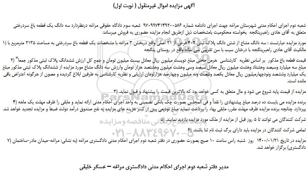 شعبه دوم اجرای احکام مدنی شهرستان مراغه جهت اجرای دادنامه شماره 9709974149200586 شعبه سوم دادگاه حقوقی مراغه درنظردارد سه دانگ یک قطعه باغ سردرختی متعلق به آقای هادی راهبرینگجه بخواسته محکومیت بامشخصات ذیل ازطریق انجام مزایده حضوری به فروش میرساند: