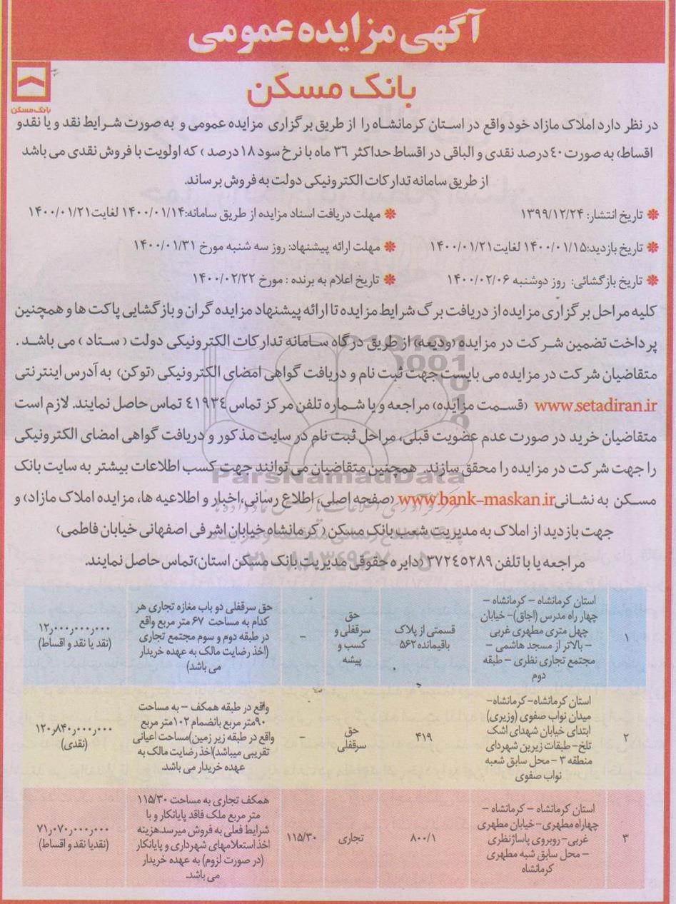 مزایده عمومی مزایده فروش املاک مازاد تجاری برگزار میگردد. از کلیه افراد متخصص و شرکتهای واجد شرایط دعوت به عمل میآید تا در این مزایده با کد خبرگزاری پارس نماد : 3272596 شرکت نمایند تاریخ شروع مزایده : 1399/12/24 مهلت شرکت در مزایده: تا پایان روز 1400/01/21