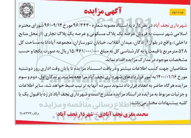 مزایده عمومی مزایده فروش یک پلاک مسکونی و یک پلاک تجاری نوبت دوم برگزار میگردد. از کلیه افراد متخصص و شرکت‌های واجد شرایط دعوت به عمل می‌آید تا در این مزایده با کد خبرگزاری پارس نماد : 3272818 شرکت نمایند تاریخ شروع مزایده : 1399/12/25 مهلت شرکت در مزایده: تا پایان روز 1400/01/16 مکان برگزاری اموال واگذاری استان‌های اصفهان و دسته‌بندی‌های مربوط به این حراجی املاک و زمین میباشد.