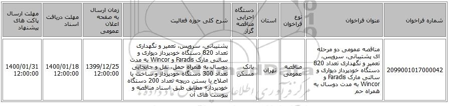2099001017000042 | مناقصه عمومی دو مرحله ای پشتیبانی، سرویس، تعمیر و نگهداری تعداد 820 دستگاه خودپرداز دیواری و سالنی مارکFaradis و Wincor به مدت دوسال به همراه حم | مناقصه عمومی | تهران | بانک مسکن | پشتیبانی، سرویس، تعمیر و نگهداری تعداد 820 دستگاه خودپرداز دیواری و سالنی مارکFaradis و Wincor به مدت دوسال به همراه حمل، نقل و جابجایی تعداد 300 دستگاه خودپرداز و ساخت یا اصلاح یا بستن دریچه تعداد 200 دستگاه خودپرداز» مطابق طبق اسناد مناقصه و پیوست های آن | 1399/12/25 12:00:00 | 1400/01/18 12:00:00 | 1400/01/31 12:00:00 |