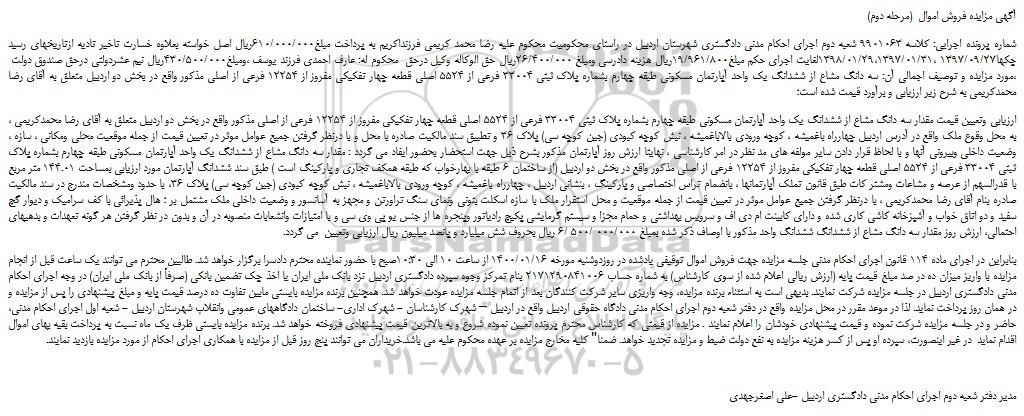 شماره پرونده اجرایی: کلاسه 9901063 شعبه دوم اجرای احکام مدنی دادگستری شهرستان اردبیل در راستای محکومیت محکوم علیه رضا محمد کریمی فرزنداکریم به پرداخت مبلغ610/000/000ریال اصل خواسته بعلاوه خسارت تاخیر تادیه ازتاریخهای رسید چکها1397/09/27 ،1398/01/29،1397/01/31لغایت اجرای حکم مبلغ19/961/800ریال هزینه دادرسی ومبلغ 26/400/000ریال حق الوکاله وکیل درحق  محکوم له: عارف احمدی فرزند یوسف ،ومبلغ430/500/000ریال نیم عشردولتی درحق صندوق دولت  ،مورد مزایده و توصیف اجمالی آن: سه دانگ مشاع از ششدانگ یک واحد آپارتمان مسکونی طبقه چهارم بشماره پلاک ثبتی 33004 فرعی از 5524 اصلی قطعه چهار تفکیکی مفروز از 12254 فرعی از اصلی مذکور واقع در بخش دو اردبیل متعلق به آقای رضا محمدکریمی به شرح زیر ارزیابی و برآورد قیمت شده است؛