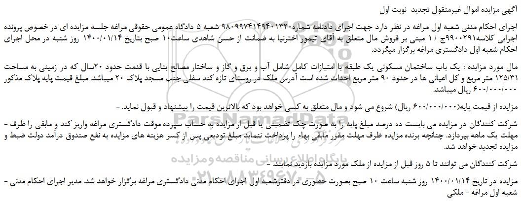 اجرای احکام مدنی شعبه اول مراغه در نظر دارد جهت اجرای دادنامه شماره9809974149401320 شعبه 5 دادگاه عمومی حقوقی مراغه جلسه مزایده ای در خصوص پرونده اجرایی کلاسه9900291ج / 1 مبنی بر فروش مال متعلق به آقای تیمور اخترنیا به ضمانت از حسن شاهدی ساعت10 صبح بتاریخ 1400/01/14 روز شنبه در محل اجرای احکام شعبه اول دادگستری مراغه برگزار میگردد.