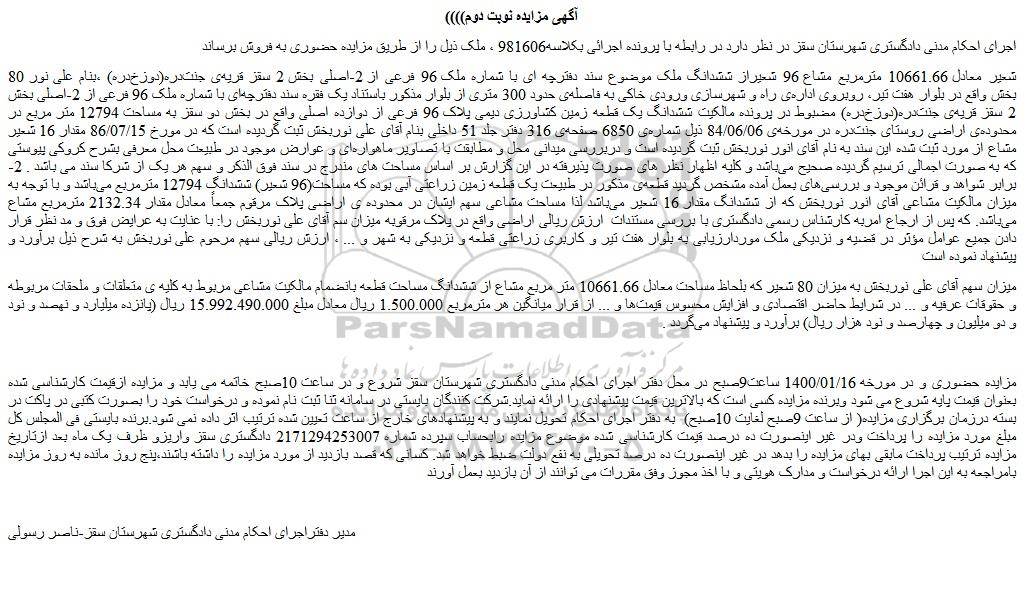 اجرای احکام مدنی دادگستری شهرستان سقز در نظر دارد در رابطه با پرونده اجرائی بکلاسه981606 ، ملک ذیل را از طریق مزایده حضوری به فروش برساند
