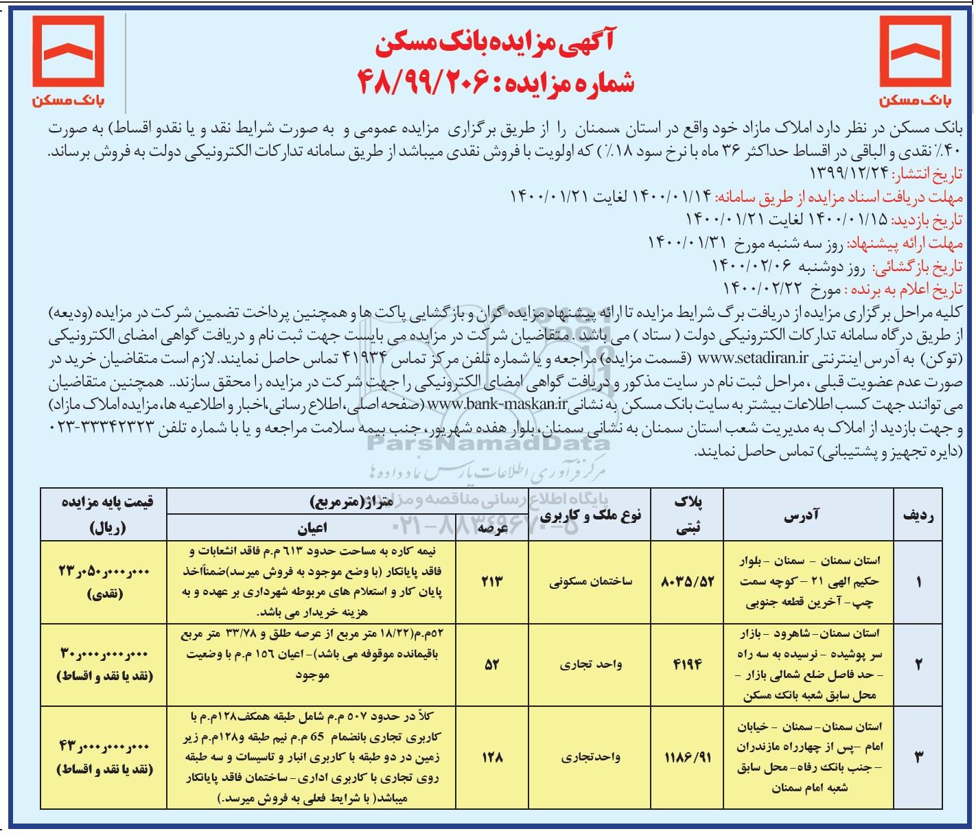 مزایده فروش املاک مازاد کابری مسکونی و تجاری شماره مزایده 48.99.206