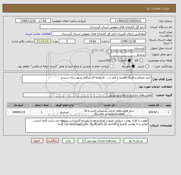 شرح کلی نیاز: خرید مصالح و اجرای قفسه و کمد و ... کتابخانه ای مرکزی شهرستان سنندج