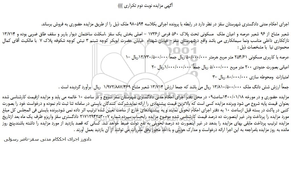 اجرای احکام مدنی دادگستری شهرستان سقز در نظر دارد در رابطه با پرونده اجرائی بکلاسه 980594 ملک ذیل را از طریق مزایده حضوری به فروش برساند.