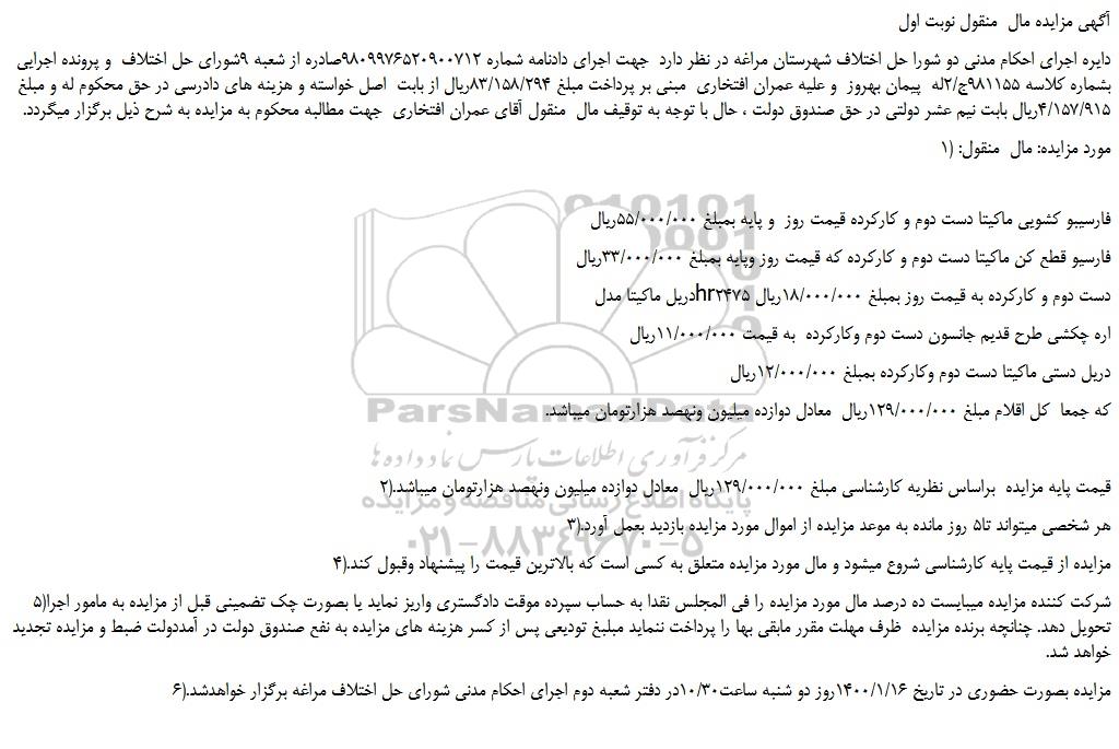 دایره اجرای احکام مدنی دو شورا حل اختلاف شهرستان مراغه در نظر دارد  جهت اجرای دادنامه شماره 9809976520900712صادره از شعبه 9شورای حل اختلاف  و پرونده اجرایی بشماره کلاسه 981155ج/2له  پیمان بهروز  و علیه عمران افتخاری  مبنی بر پرداخت مبلغ 83/158/294ریال از بابت  اصل خواسته و هزینه های دادرسی در حق محکوم له و مبلغ 4/157/915ریال بابت نیم عشر دولتی در حق صندوق دولت ، حال با توجه به توقیف مال  منقول آقای عمران افتخاری  جهت مطالبه محکوم به مزایده به شرح ذیل برگزار میگردد.