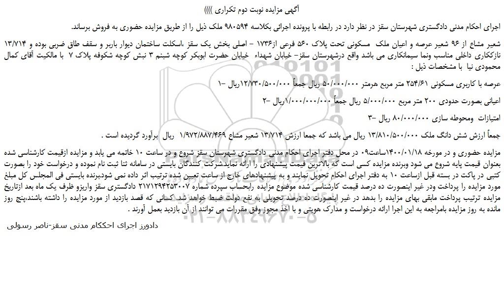 اجرای احکام مدنی دادگستری شهرستان سقز در نظر دارد در رابطه با پرونده اجرائی بکلاسه 980594 ملک ذیل را از طریق مزایده حضوری به فروش برساند.