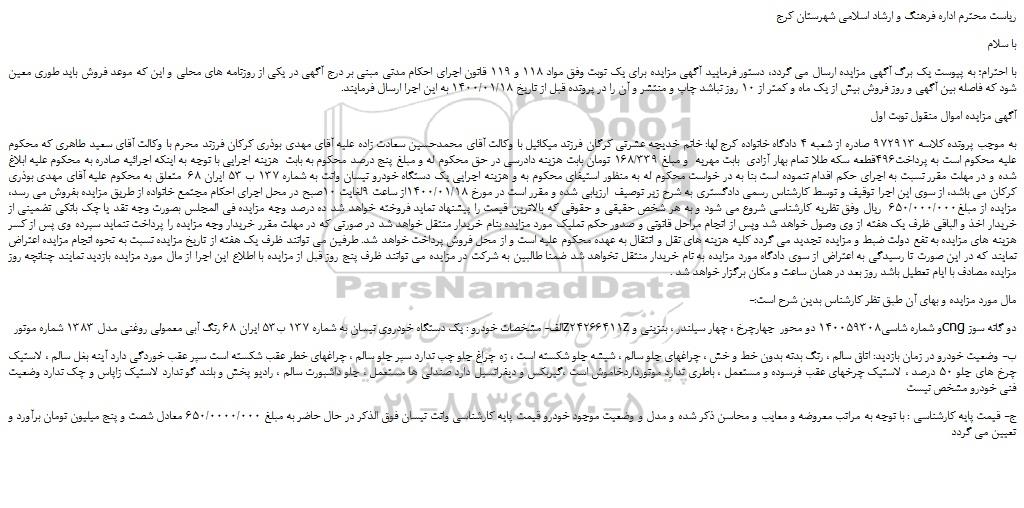 به موجب پرونده کلاسه 972913 صادره از شعبه 4 دادگاه خانواده کرج لها: خانم خدیجه عشرتی کرگان فرزند میکائیل با وکالت آقای محمدحسین سعادت زاده علیه آقای مهدی بوذری کرکان فرزند محرم با وکالت آقای سعید طاهری که محکوم علیه محکوم است به پرداخت496قطعه سکه طلا تمام بهار آزادی  بابت مهریه  و مبلغ 168/339 تومان بابت هزینه دادرسی در حق محکوم له و مبلغ پنج درصد محکوم به بابت  هزینه اجرایی با توجه به اینکه اجرائیه صادره به محکوم علیه ابلاغ شده و در مهلت مقرر نسبت به اجرای حکم اقدام ننموده است بنا به در خواست محکوم له به منظور استیفای محکوم به و هزینه اجرایی یک دستگاه خودرو نیسان وانت به شماره 137 ب 53 ایران 68  متعلق به محکوم علیه آقای مهدی بوذری کرکان می باشد، از سوی این اجرا توقیف و توسط کارشناس رسمی دادگستری به شرح زیر توصیف  ارزیابی شده و مقرر است در مورخ 1400/01/18از ساعت 9لغایت 10صبح در محل اجرای احکام مجتمع خانواده از طریق مزایده بفروش می رسد، مزایده از مبلغ650/000/000  ریال وفق نظریه کارشناسی شروع می شود و به هر شخص حقیقی و حقوقی که بالاترین قیمت را پیشنهاد نماید فروخته خواهد شد ده درصد وجه مزایده فی المجلس بصورت وجه نقد یا چک بانکی تضمینی از خریدار اخذ و الباقی ظرف یک هفته از وی وصول خواهد شد وپس از انجام مراحل قانونی و صدور حکم تملیک مورد مزایده بنام خریدار منتقل خواهد شد در صورتی که در مهلت مقرر خریدار وجه مزایده را پرداخت ننماید سپرده وی پس از کسر هزینه های مزایده به نفع دولت ضبط و مزایده تجدید می گردد کلیه هزینه های نقل و انتقال به عهده محکوم علیه است و از محل فروش پرداخت خواهد شد. طرفین می توانند ظرف یک هفته از تاریخ مزایده نسبت به نحوه انجام مزایده اعتراض نمایند که در این صورت تا رسیدگی به اعتراض از سوی دادگاه مورد مزایده به نام خریدار منتقل نخواهد شد ضمنا طالبین به شرکت در مزایده می توانند ظرف پنج روز قبل از مزایده با اطلاع این اجرا از مال مورد مزایده بازدید نمایند چنانچه روز مزایده مصادف با ایام تعطیل باشد روز بعد در همان ساعت و مکان برگزار خواهد شد .