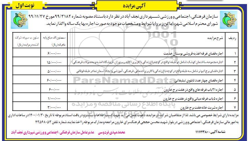 سازمان فرهنگی، اجتماعی و ورزشی شهرداری نجف آباد در نظر دارد باستناد مصوبه شماره 99/3182 مورخ 99.11.27 شورای اسلامی شهر، اماکن زیر را با شرایط و مشخصات موجود به صورت اجاره بها یک ساله واگذار نماید .