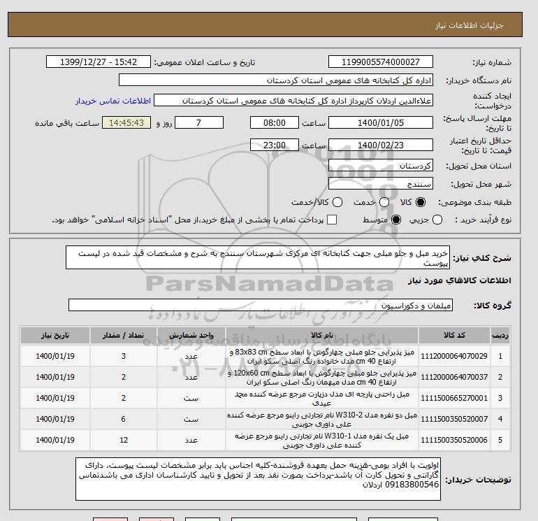 شرح کلی نیاز: خرید مبل و جلو مبلی جهت کتابخانه ای مرکزی شهرستان سنندج به شرح و مشخصات قید شده در لیست پیوست