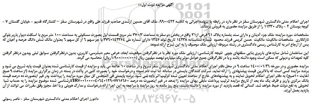 اجرای احکام مدنی دادگستری شهرستان سقز در نظر دارد در رابطه با پرونده اجرائی به کلاسه 9900422، ملک آقای حسین ارشدی صاحب فرزند علی واقع در شهرستان سقز – کشتارگاه قدیم - خیابان گلستان 7 - کوچه بوستان 2 - پلاک 11330 را از طریق مزایده حضوری به فروش برساند.
