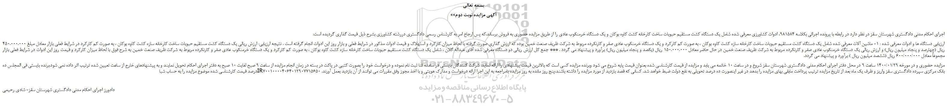 اجرای احکام مدنی دادگستری شهرستان سقز در نظر دارد در رابطه با پرونده اجرائی بکلاسه 981584، ادوات کشاورزی معرفی شده شامل یک دستگاه کشت مستقیم حبوبات ساخت کارخانه کشت کاوه بوکان و یک دستگاه خرمنکوب عادی را از طریق مزایده حضوری به فروش برساند.که پس ارجاع امر به کارشناس رسمی دادگستری دررشته کشاورزی بشرح ذیل قیمت گذاری گردیده است: