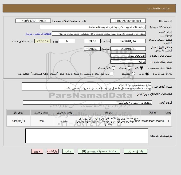 شرح کلی نیاز: مایع دستشویی اوه 4لیتری پرداخت5ماهه هزینه حمل تا محل بیمارستان به عهده فروشنده می باشد.